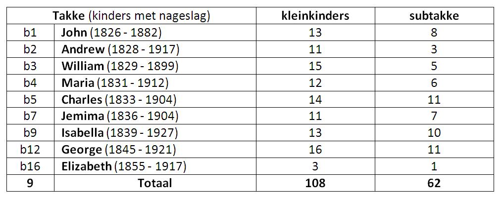 Van hierdie 16 kinders is 4 klein dood - b6 George (6); b8 Isabella (1); b13 Robert (3); en b15 Margaret (5) - terwyl b10 Catherine as jong meisie op 19-jarige ouderdom dood is. Van die oorblywende 11 kinders wat volwassenheid bereik het, het een seun - b11 James (71) - en een dogter - b14 Helen (88) - nooit getrou nie. Al 9 kinders wat getrou het en ‘n nageslag nagelaat het, het lewenslank in pastorieë gebly: al 5 die seuns het predikante geword en al 4 die dogters het met predikante getrou! Die jongste dogter - b16 Elizabeth - se eggenoot is op relatief jong ouderdom oorlede en sy het net 3 kinders gehad. Die ander 8 getroude kinders se gesinne het gewissel tussen 11 en 16 kinders elk. Gevolglik het Oupa Andrew en Ouma Maria nie net 16 kinders gehad nie, maar ook 108 kleinkinders!